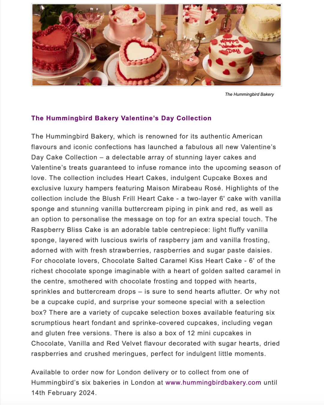 Press: The Hummingbird Bakery Valentine’s Collection Featured in JustLuxe Online